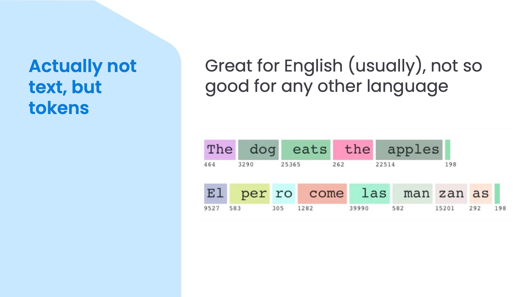 But actually, the input to LLMs is not text, but tokens. Internally, these tokens are represented by numbers. For example, some of the 7B open models I checked have a token vocabulary of around 32,000. The most common words in this vocabulary often include a leading space, because that makes it faster and cheaper to process than having a separate token for the space. These words in the top are mapped to one token each. However, for languages other than English – like Spanish in this example – the tokens may be more like syllables. So, most text in Spanish would require more tokens than the same text in English. This matters if you use hosted APIs, such as the OpenAI API, which charge by the token. This is more of a problem if you're building something for languages other than English or text with a lot of special characters, but unfortunately to change the tokeniser (and training data language) you need to pretrain a model from scratch, so not an issue you can easily do something about.